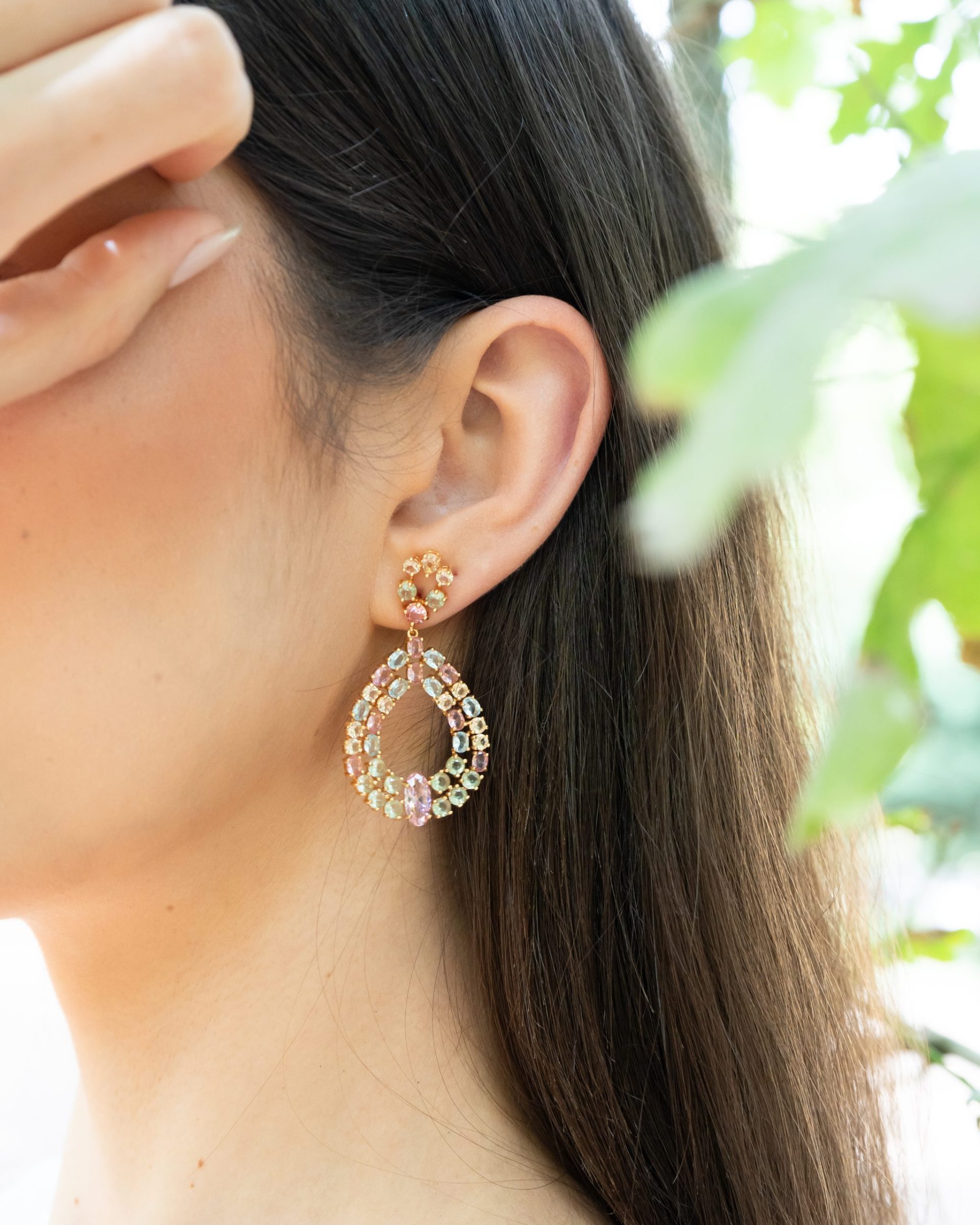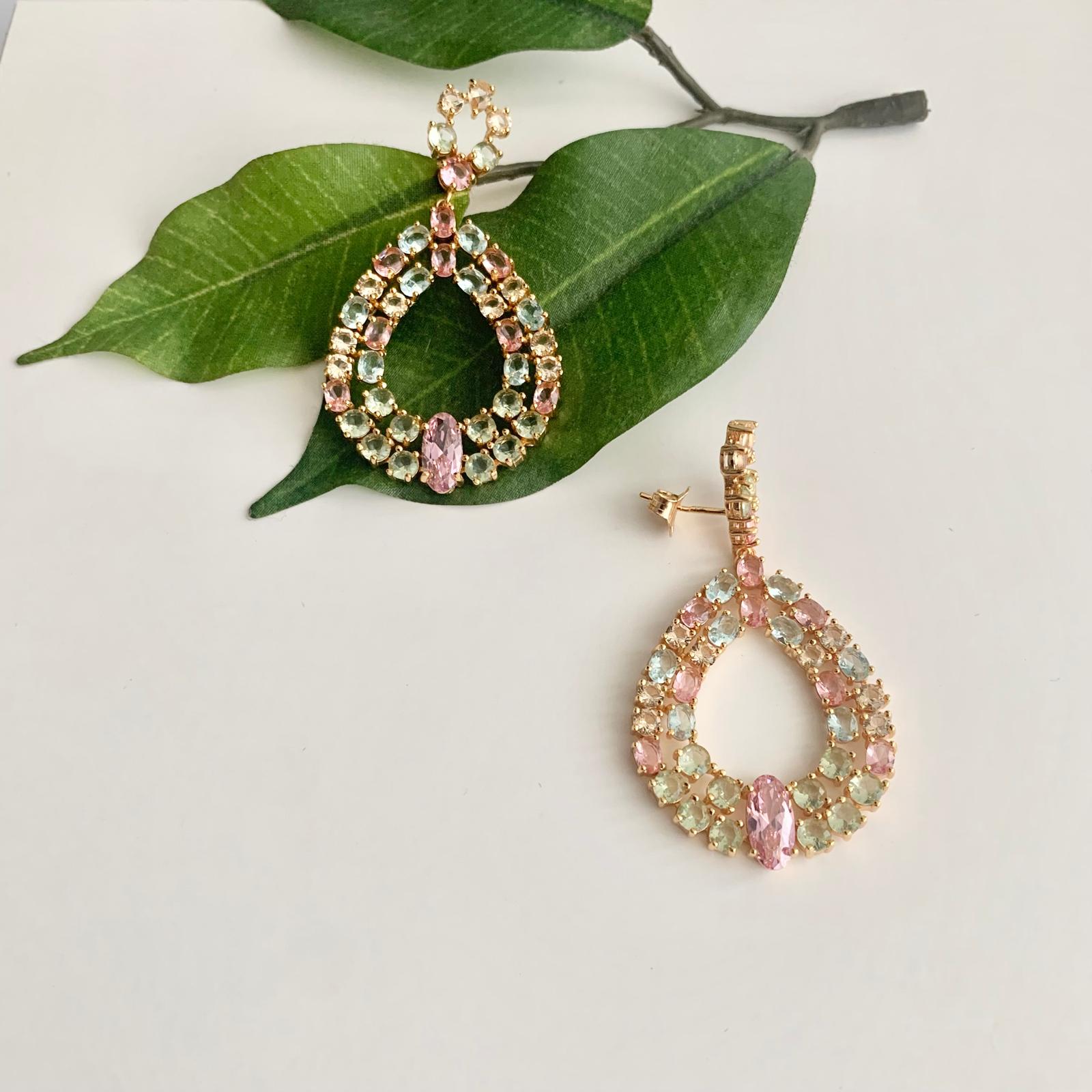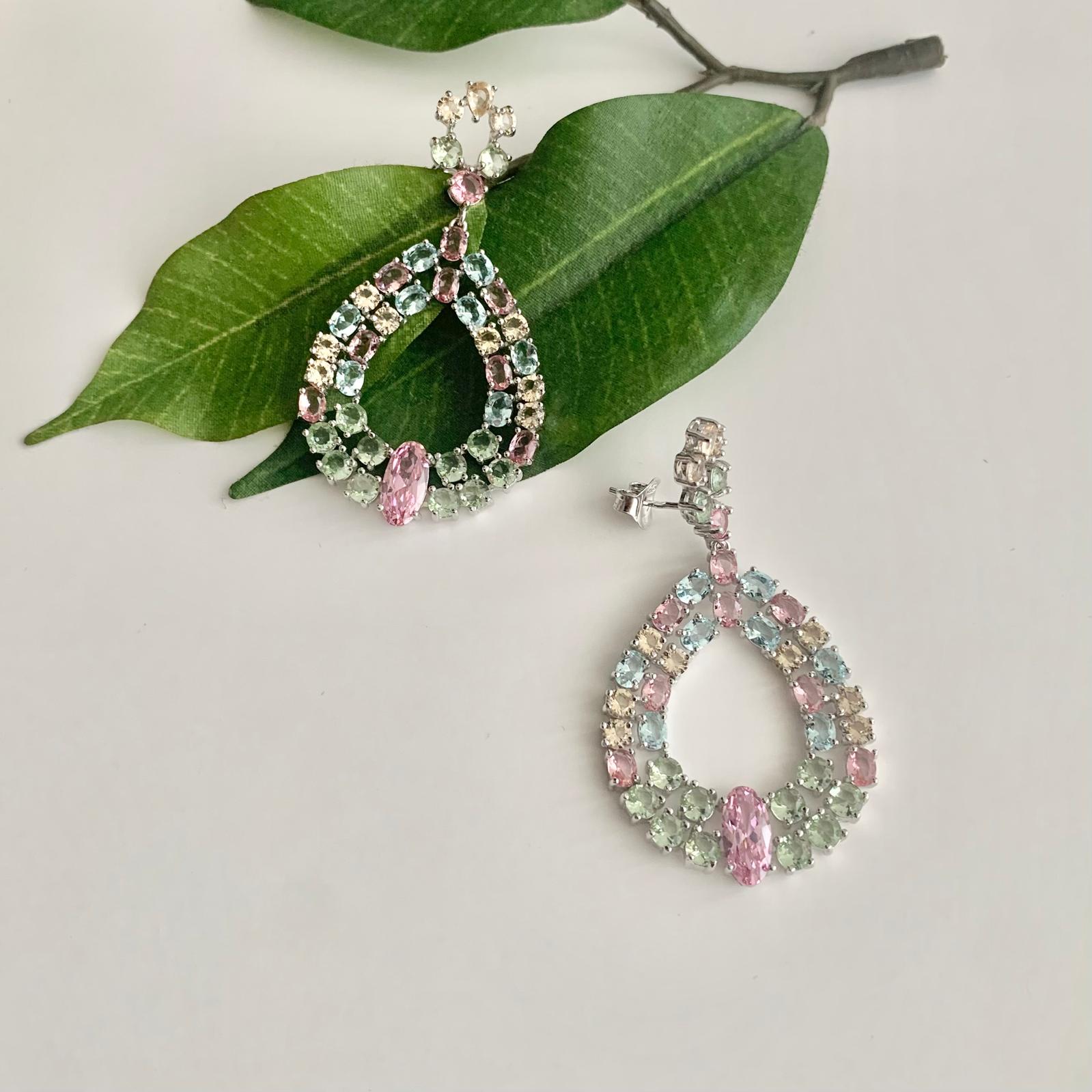 Brincos em prata de lei formato ovalado com zircónias coloridas.