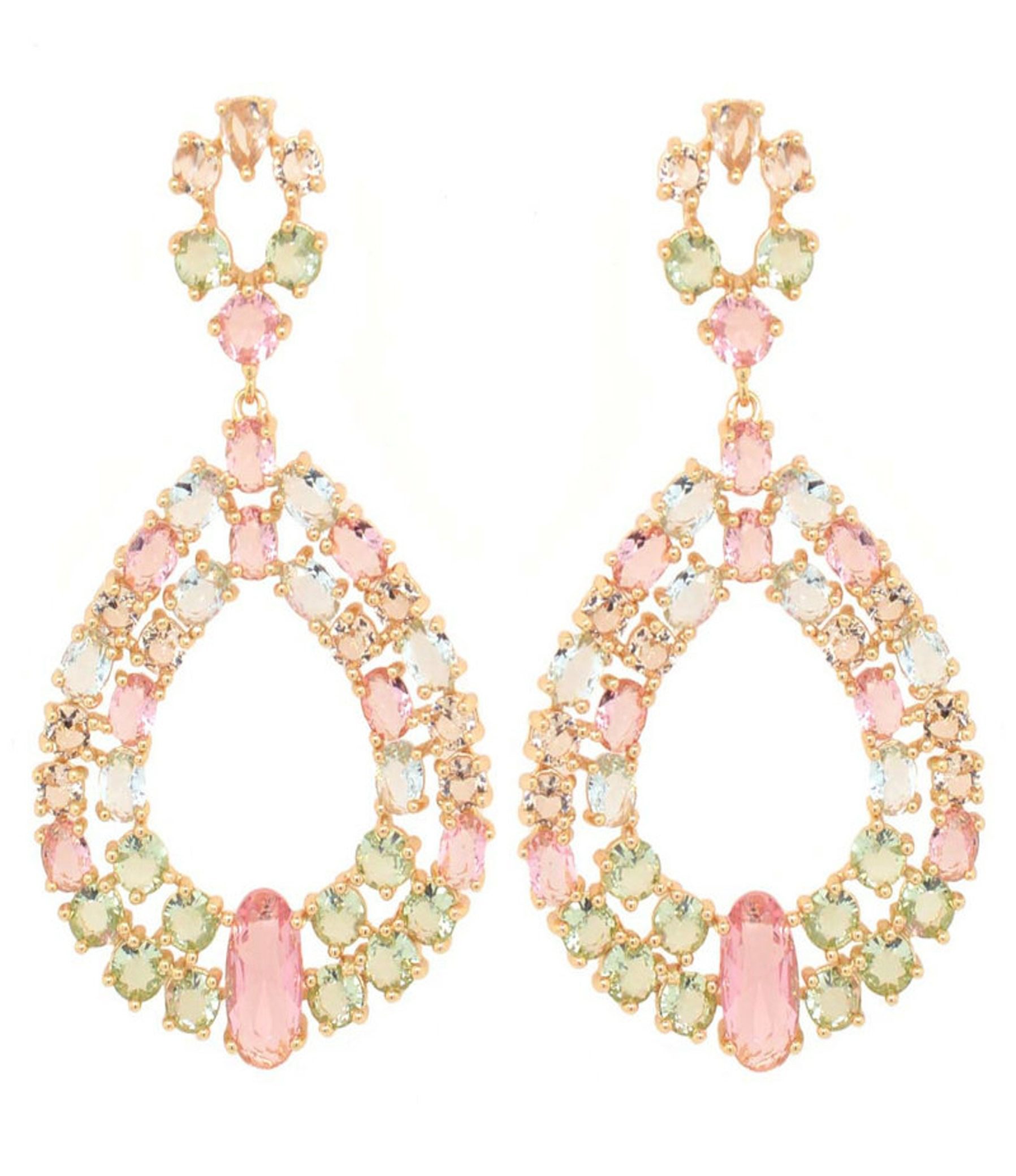 Brincos em prata ovalados com zircónias de diferentes formatos e cores. Com 5 cm de comprimento.