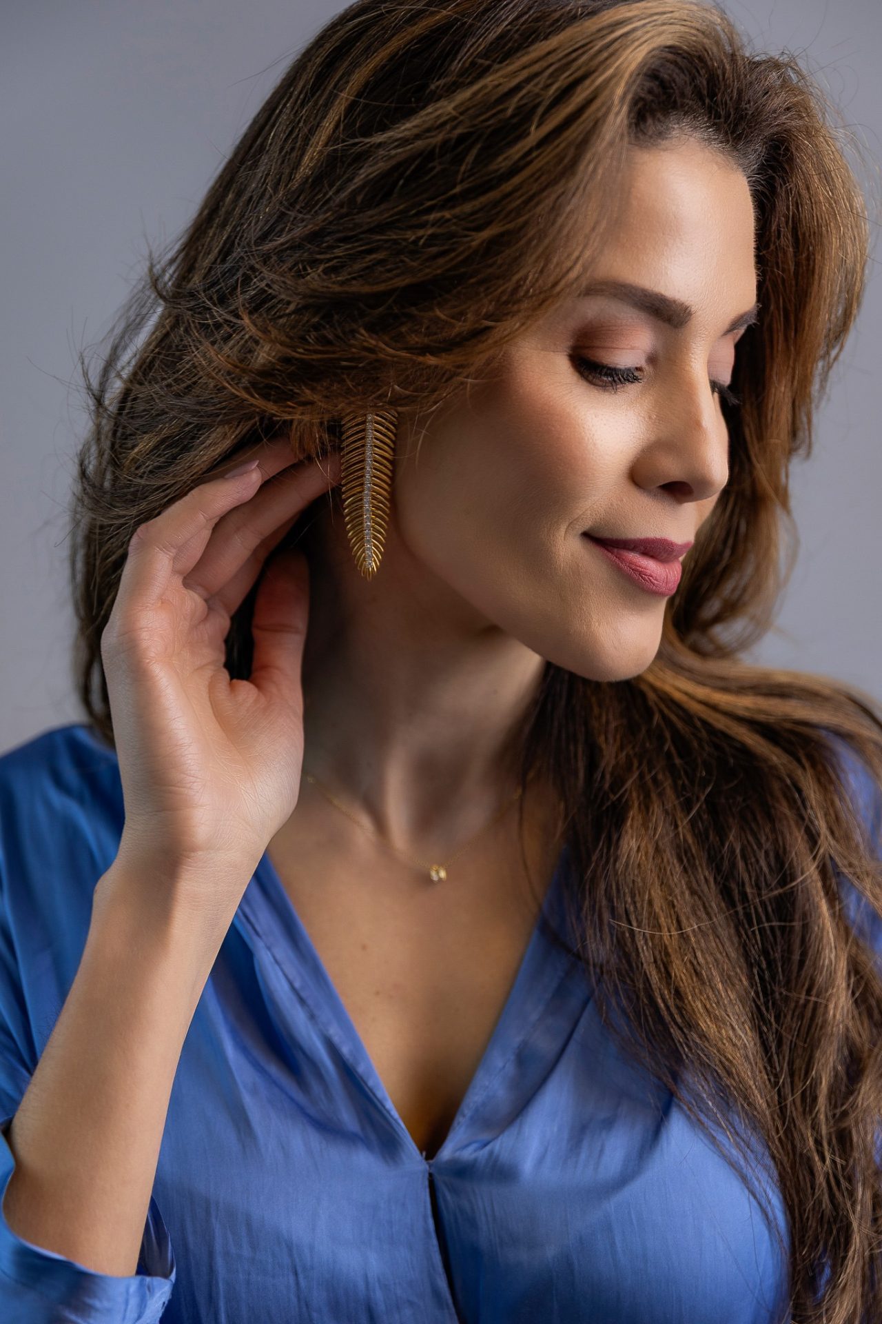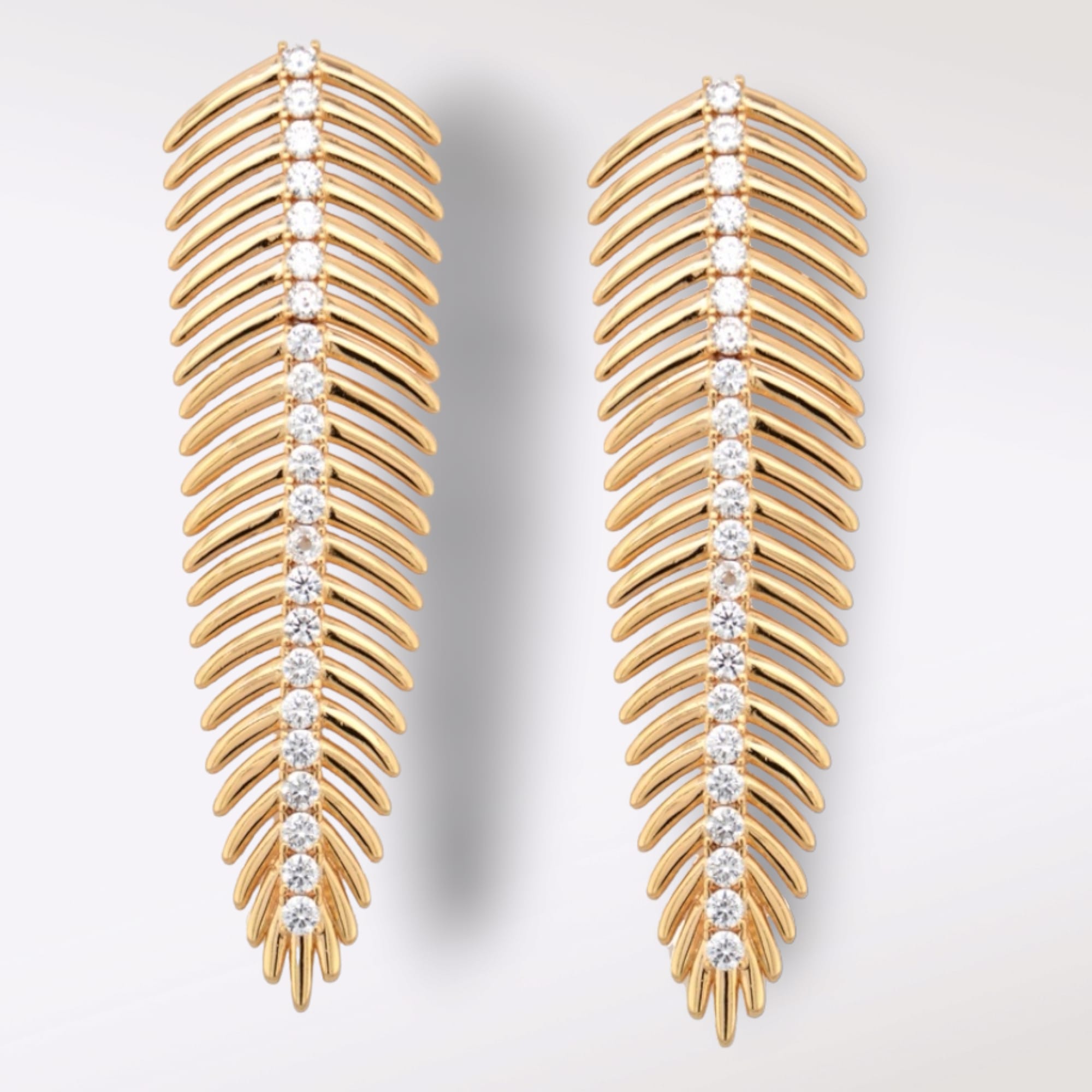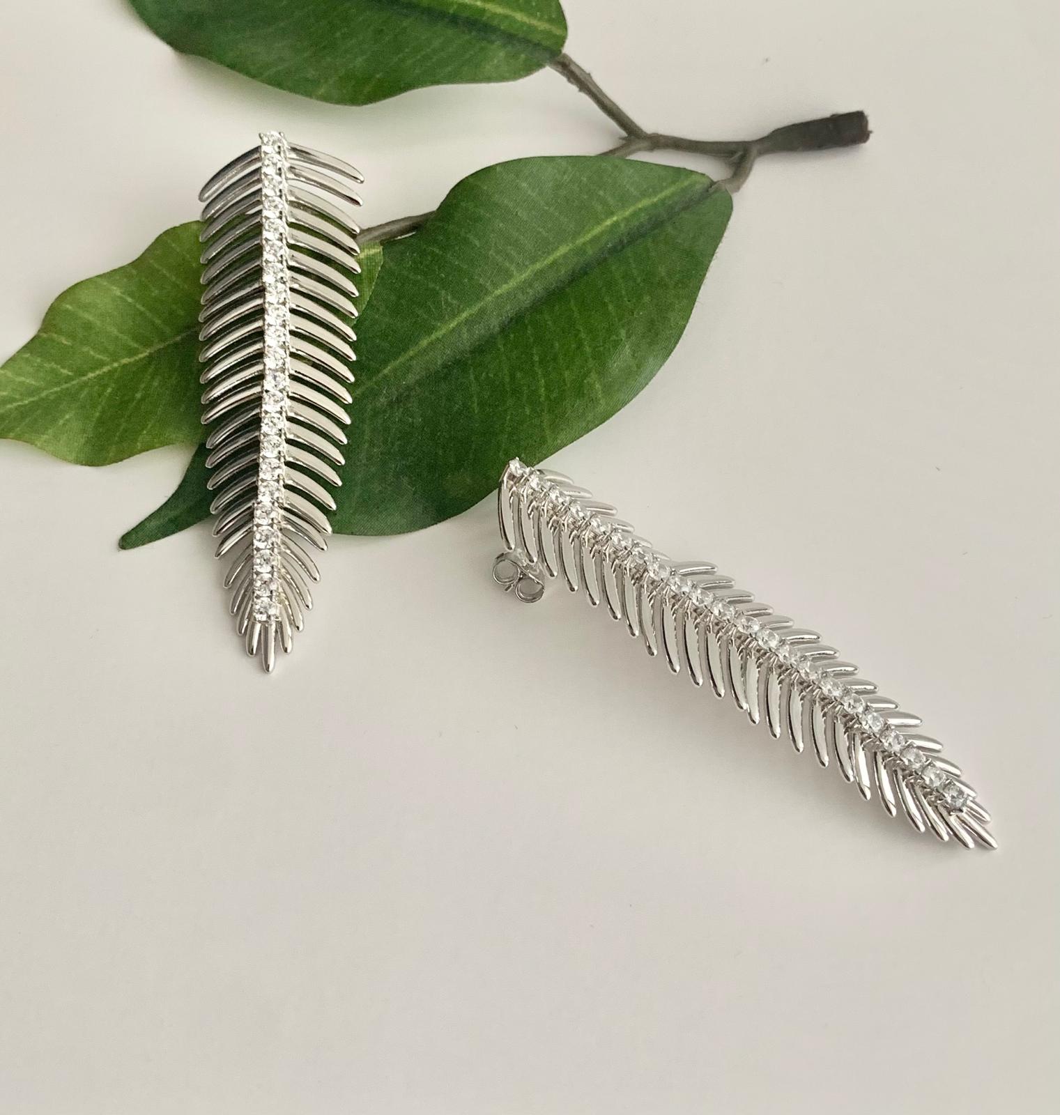 Brincos em prata compridos com forma “espinha” e maleáveis. São divididos em quatros partes, que lhes confere movimento. Zircónias ao longo de 6,5 cm de comprimento.