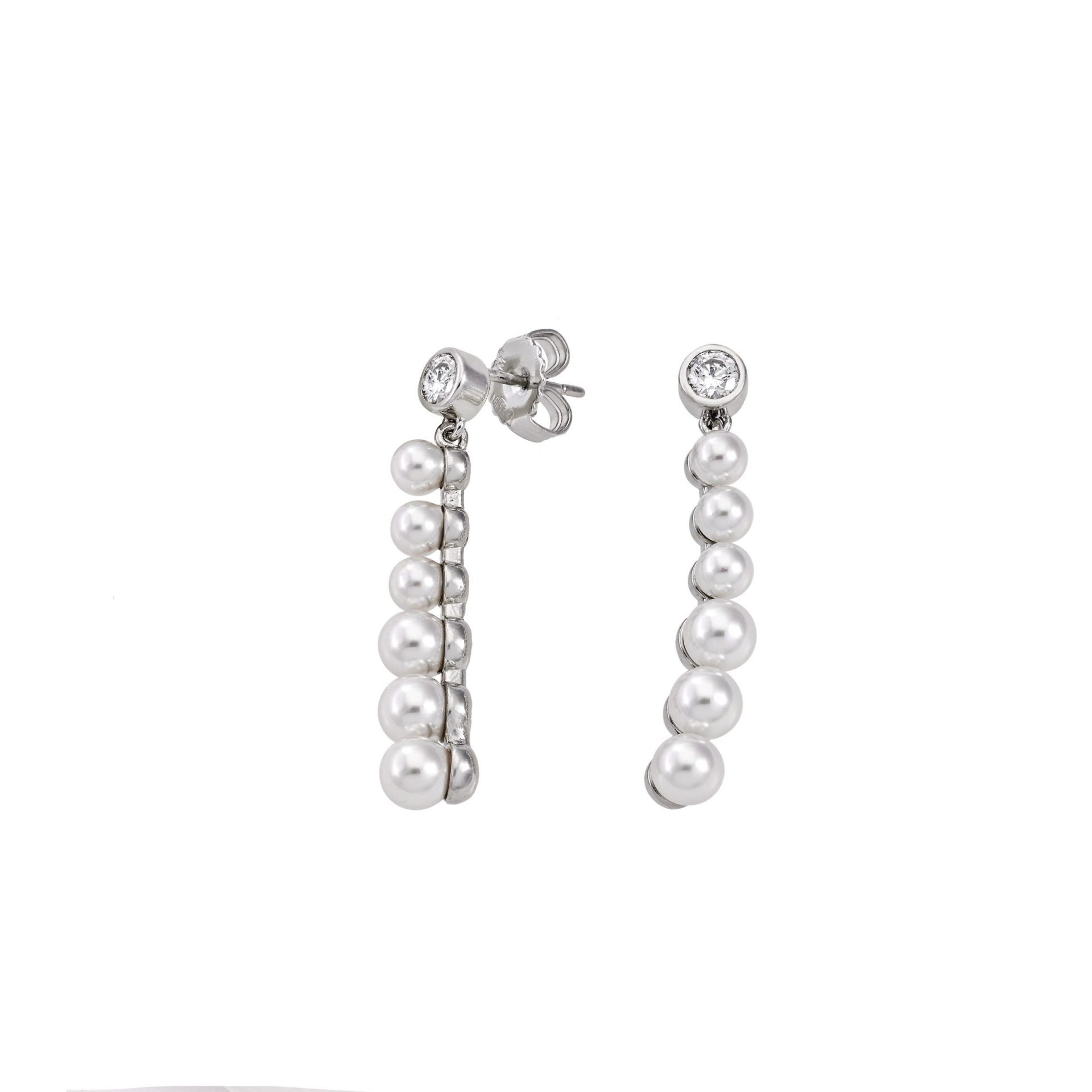 Brincos Belvedere com pérolas orgânicas de 4-5 mm produzidas na ilha de Maiorca. Prata de lei 925 com banho de ródio.
