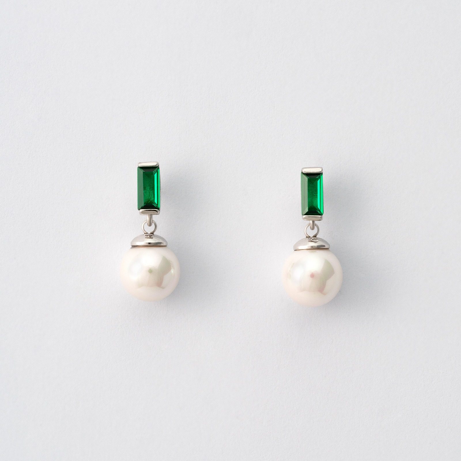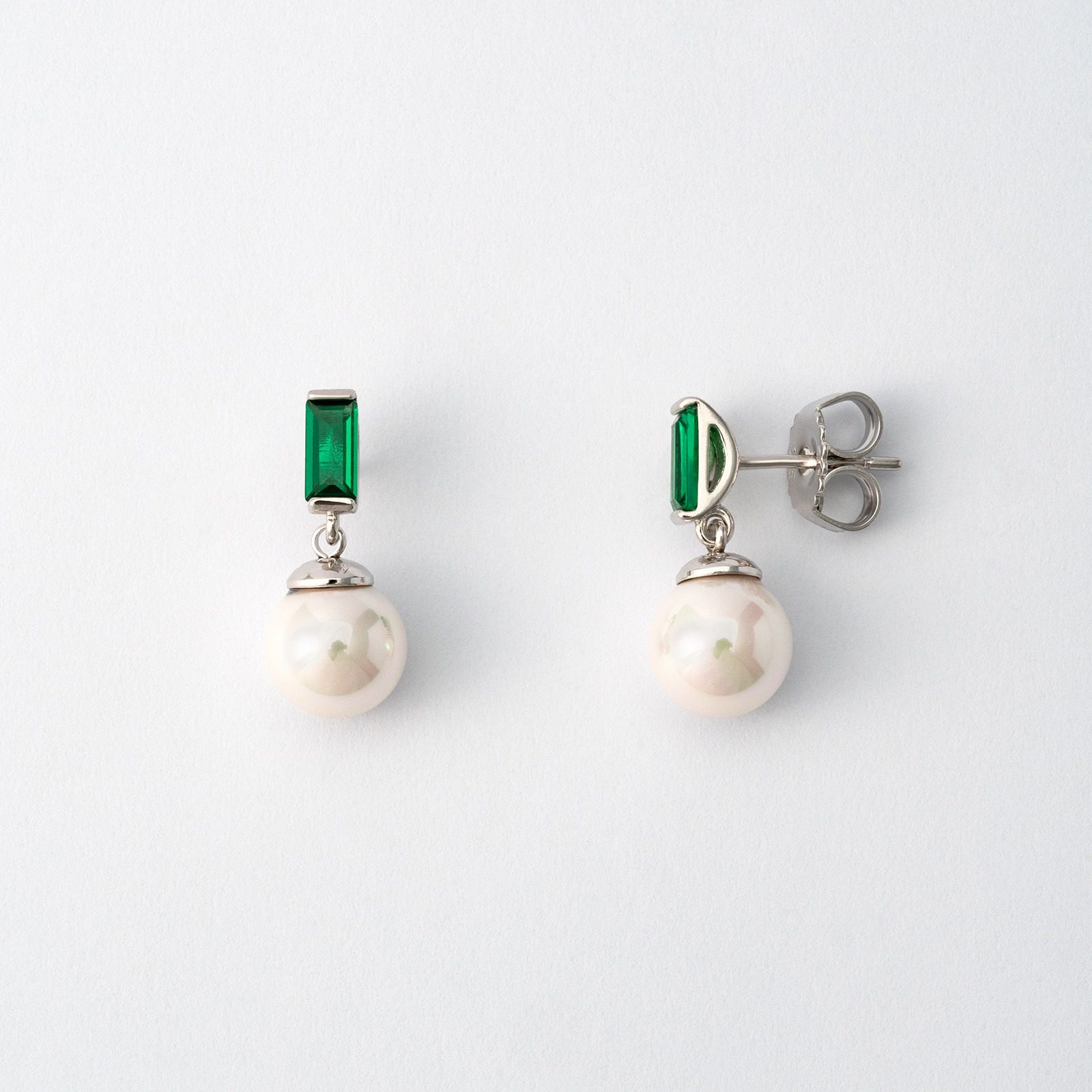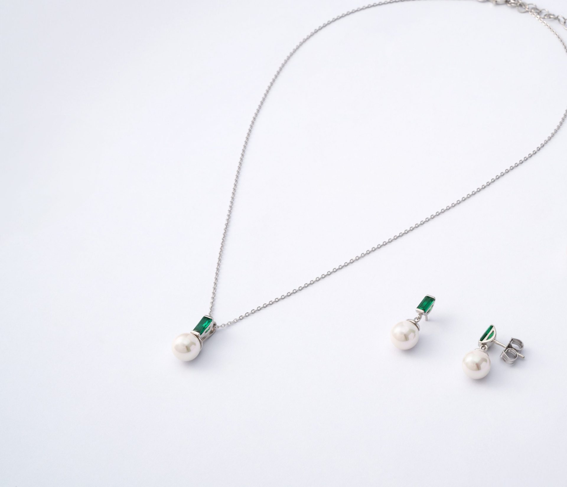 Conjunto Selene de brincos e colar com pérolas orgânicas de 8 mm produzidas na ilha de Maiorca e zircónia verde. Prata de lei 925 com banho de ródio.