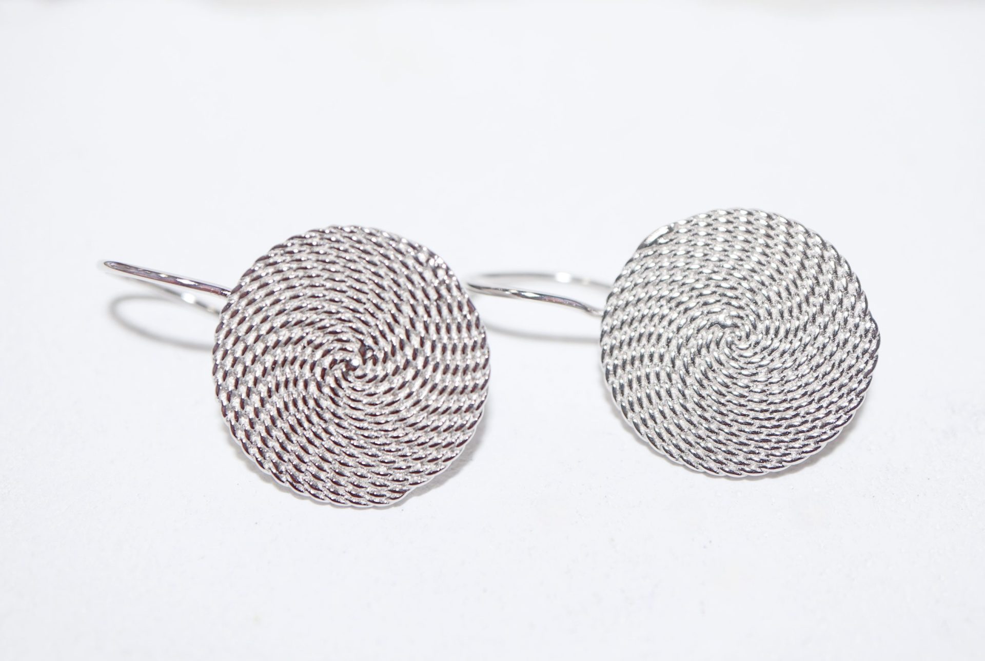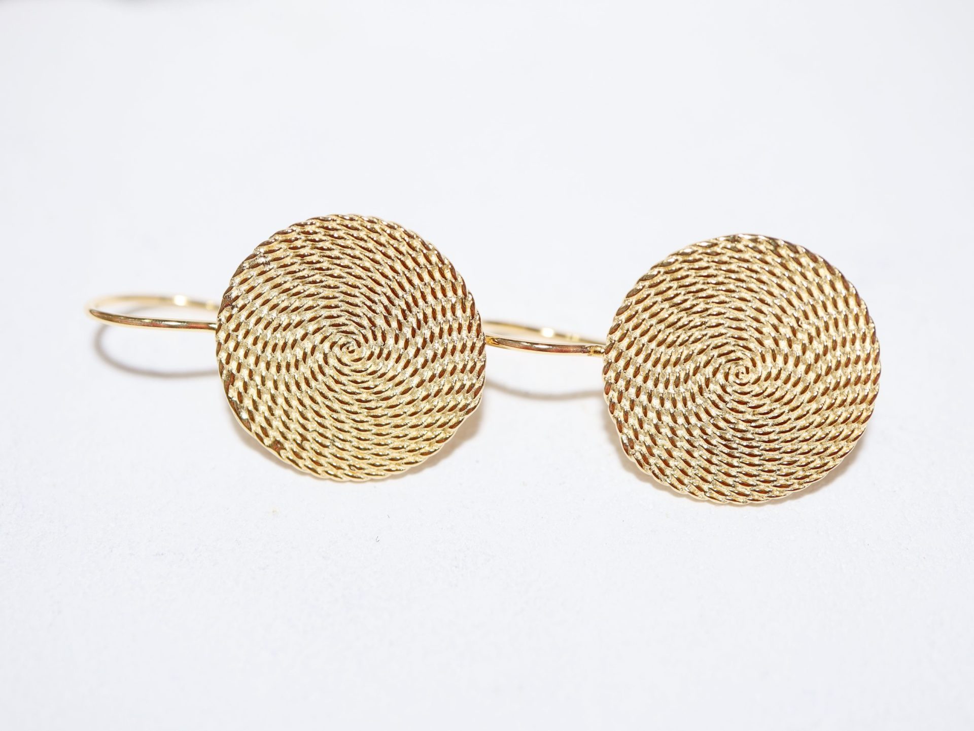 Brincos de gancho com formato de roda. Efeito espiral miudinha.