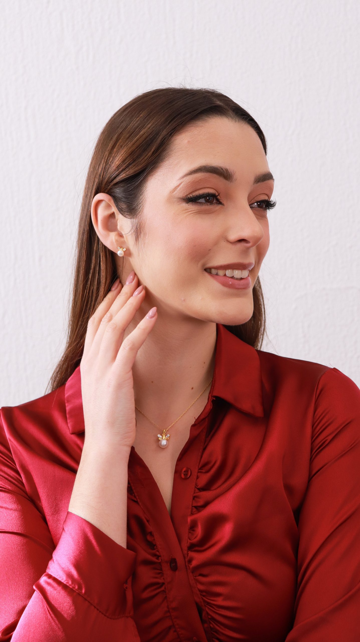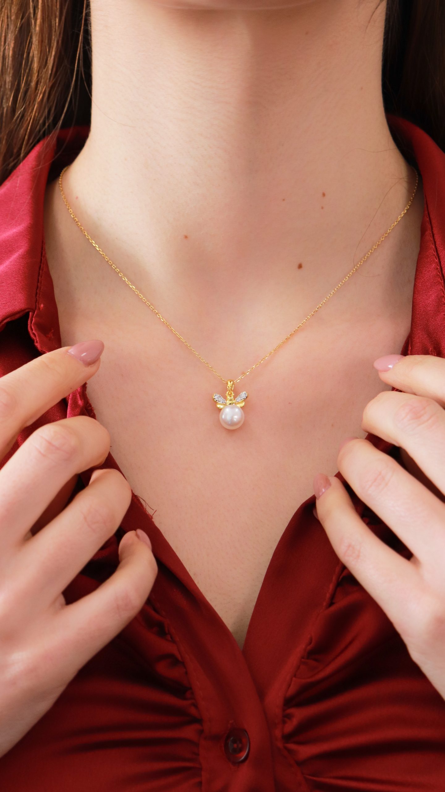 Colar com uma abelha. As asas têm zircónias cravadas e uma pérola na parte inferior da abelha, conferindo um toque extra de brilho e delicadeza.
