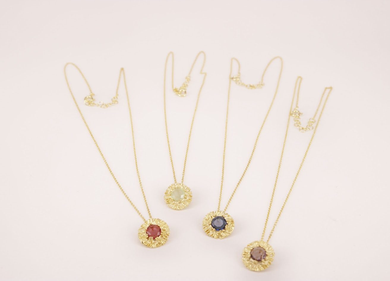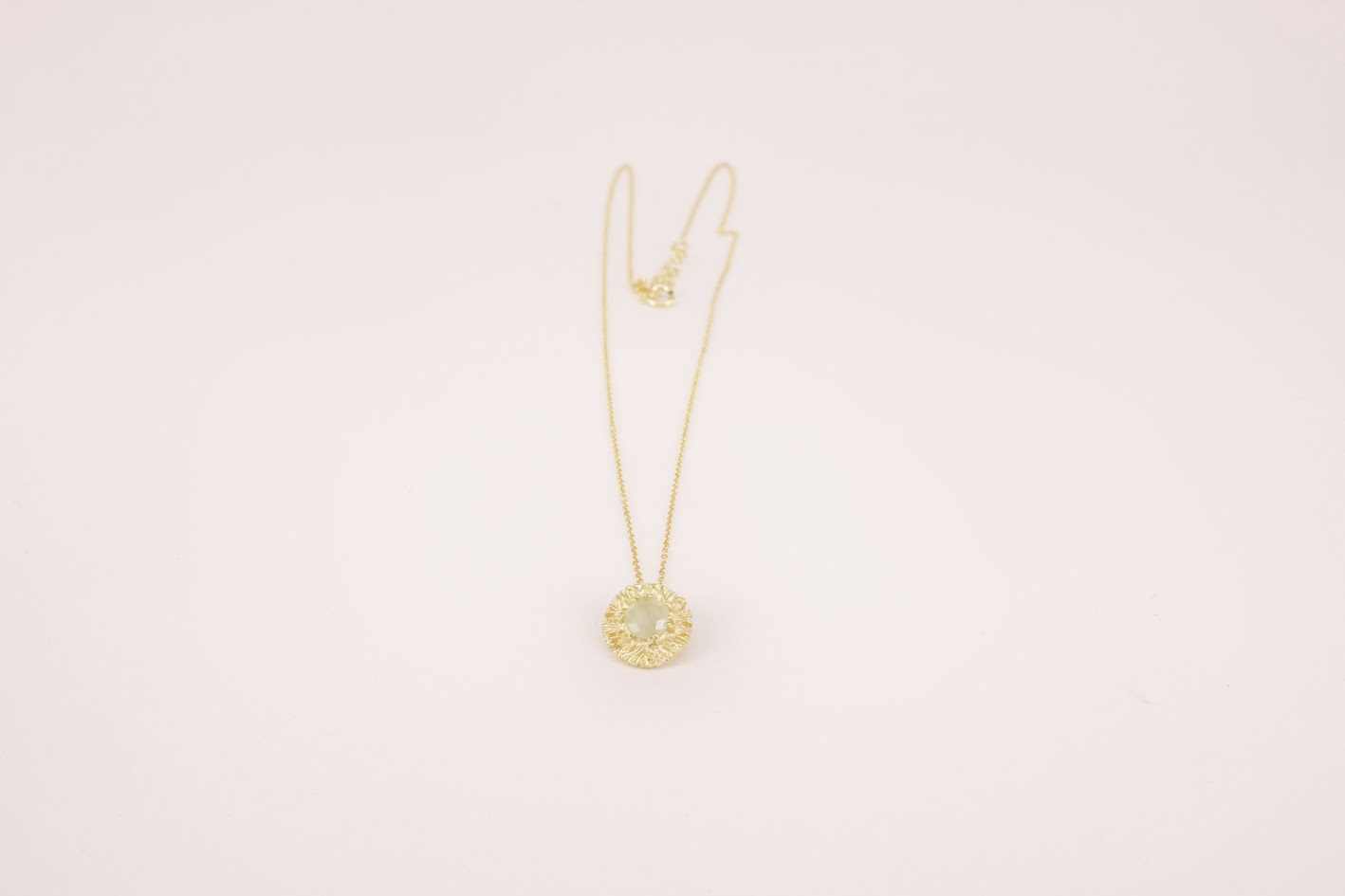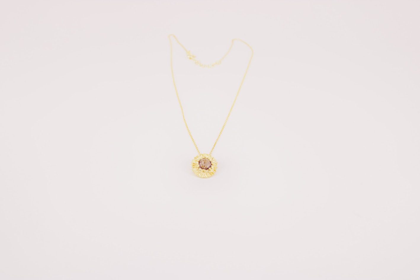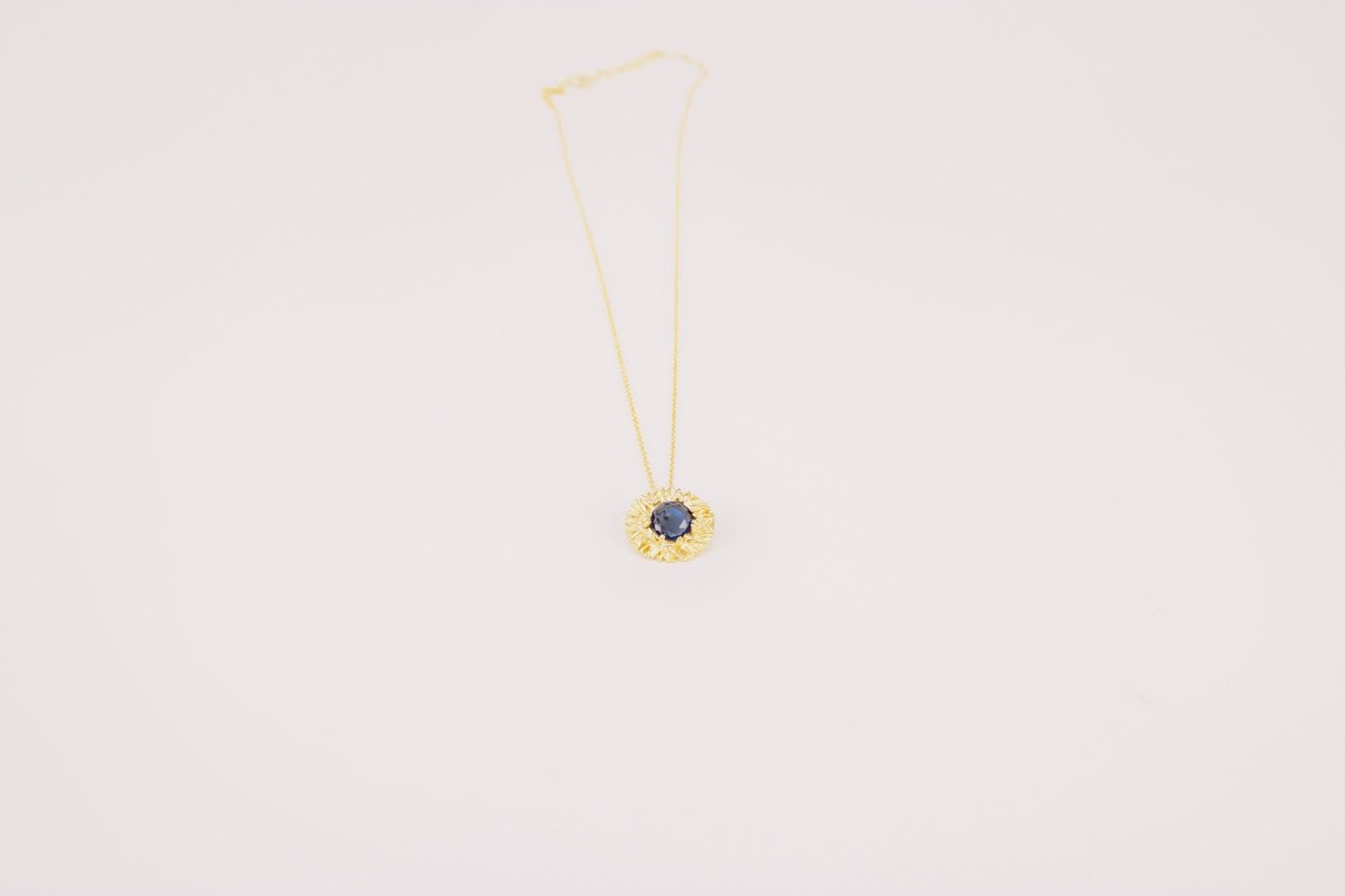 Colar em prata de lei com peça central redonda com efeito rendilhado com a inserção de uma pedra sintética redonda ao centro.