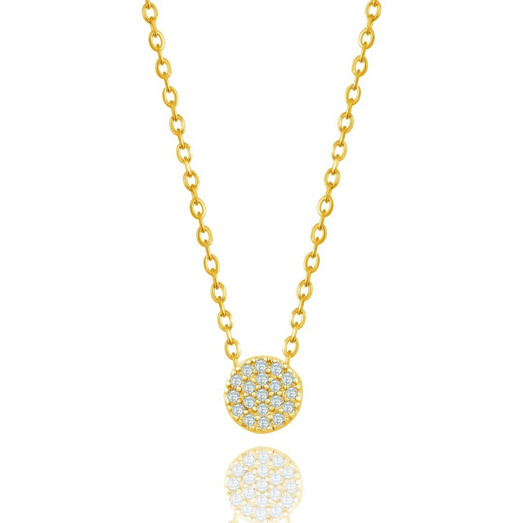 Colar com berloque. Feitio circular com cravação de zircónias em toda a superfície.