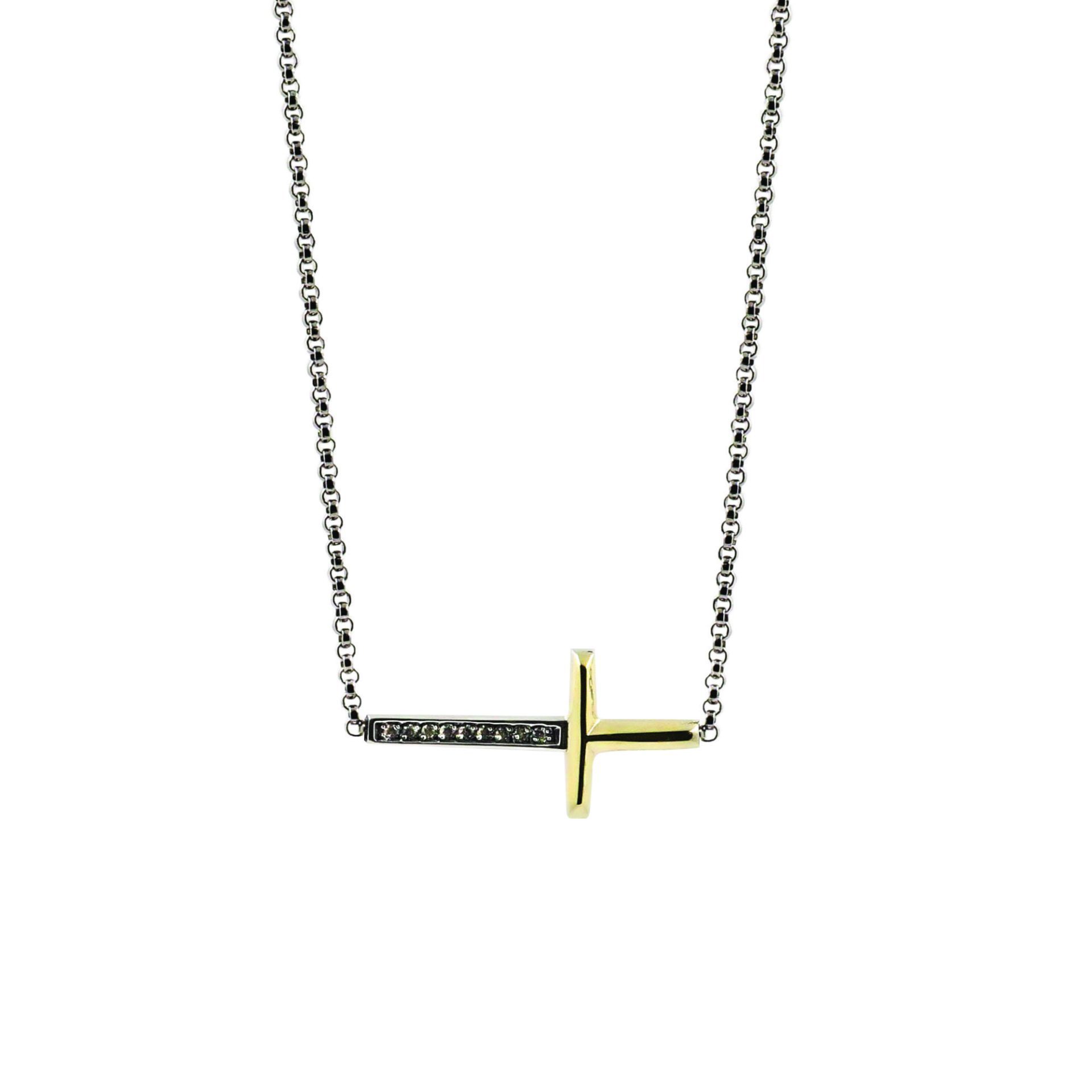 Colar malha de cordão em prata e com medalha de cruz deitada no seguimento do fio, com ouro (9kt) e zircónias.