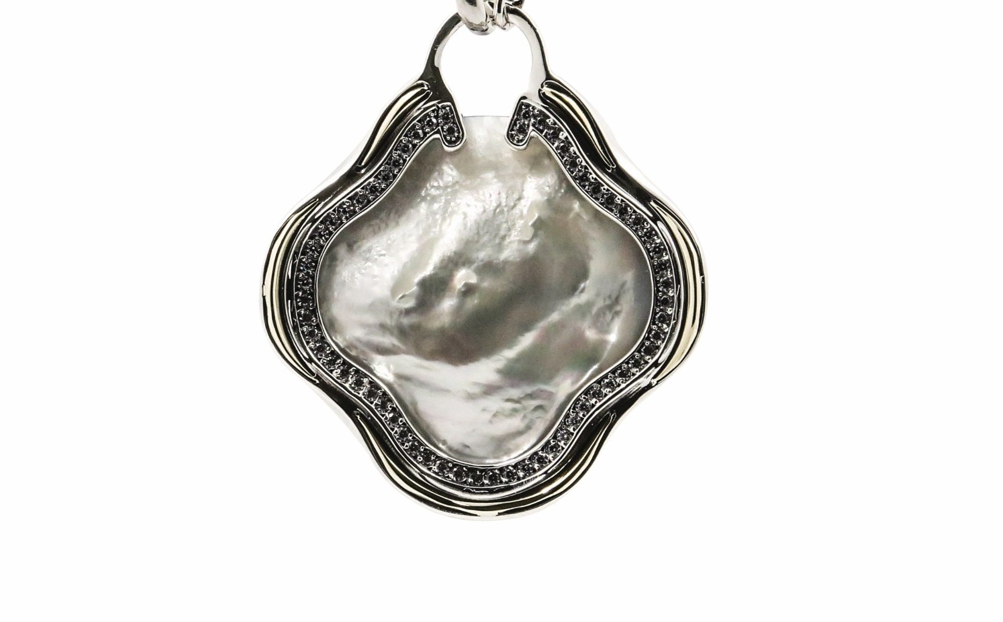 Colar malha de cordão em prata e medalha em prata com uma madrepérola no topo, rodeado por zircónias e um fio de ouro (9 kt).