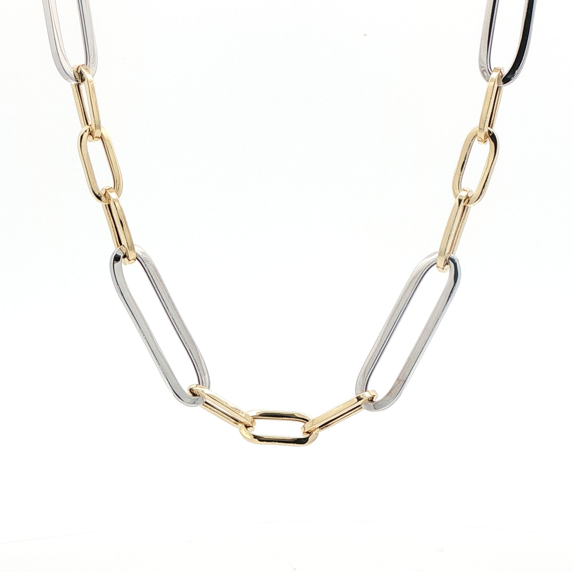 Colar em prata de lei com elos intercalados em prateado e em dourado. Elos de diferentes comprimentos.
