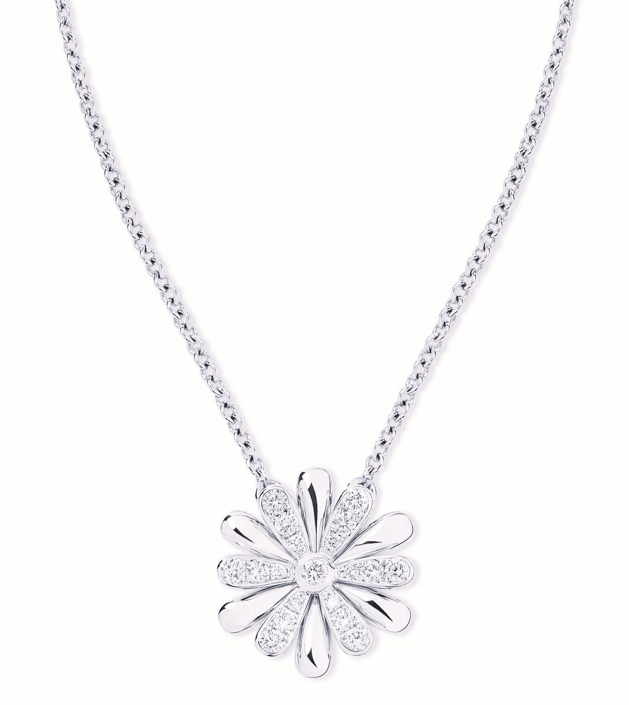 Colar com berloque em formato de flor. Cravação das pétalas alternadamente.