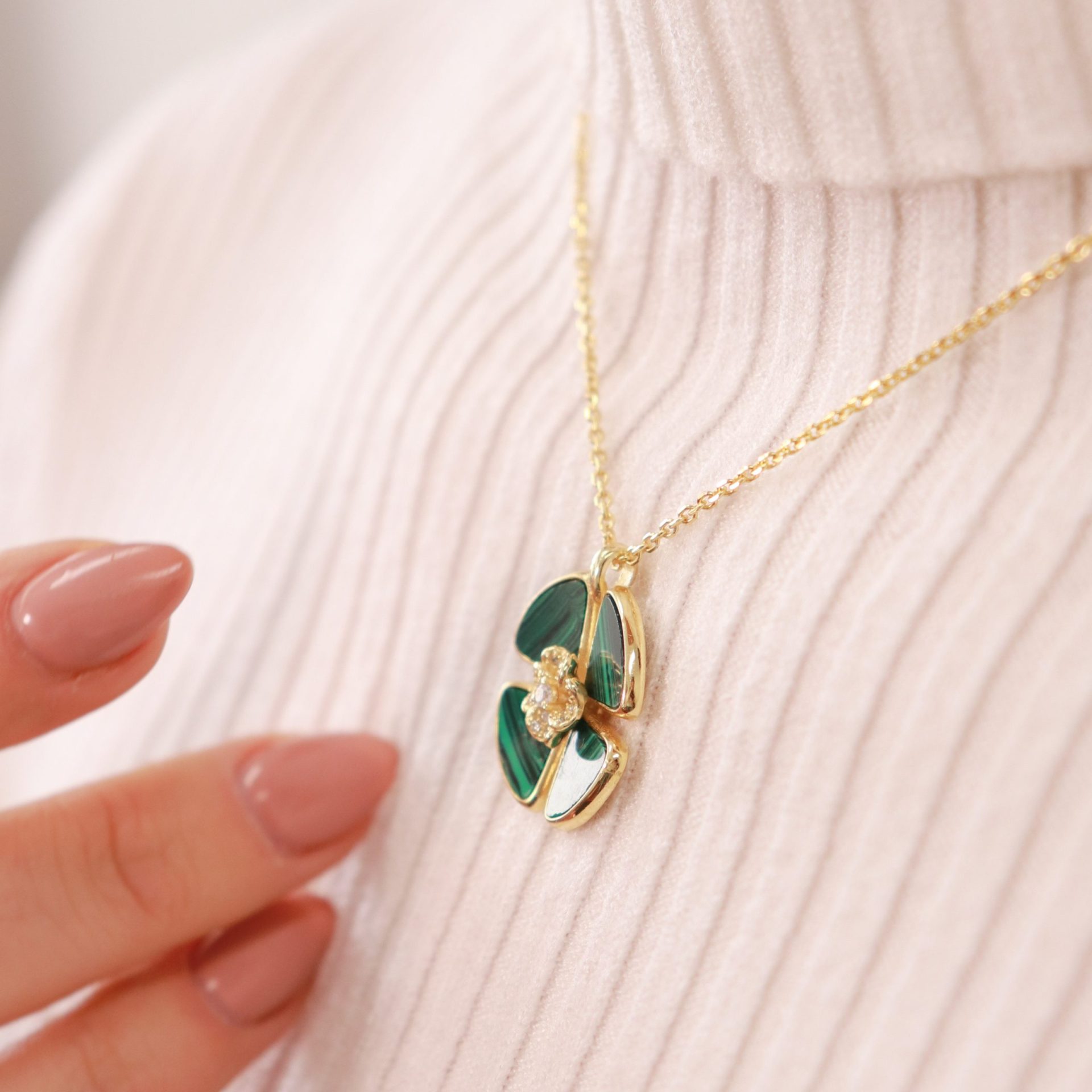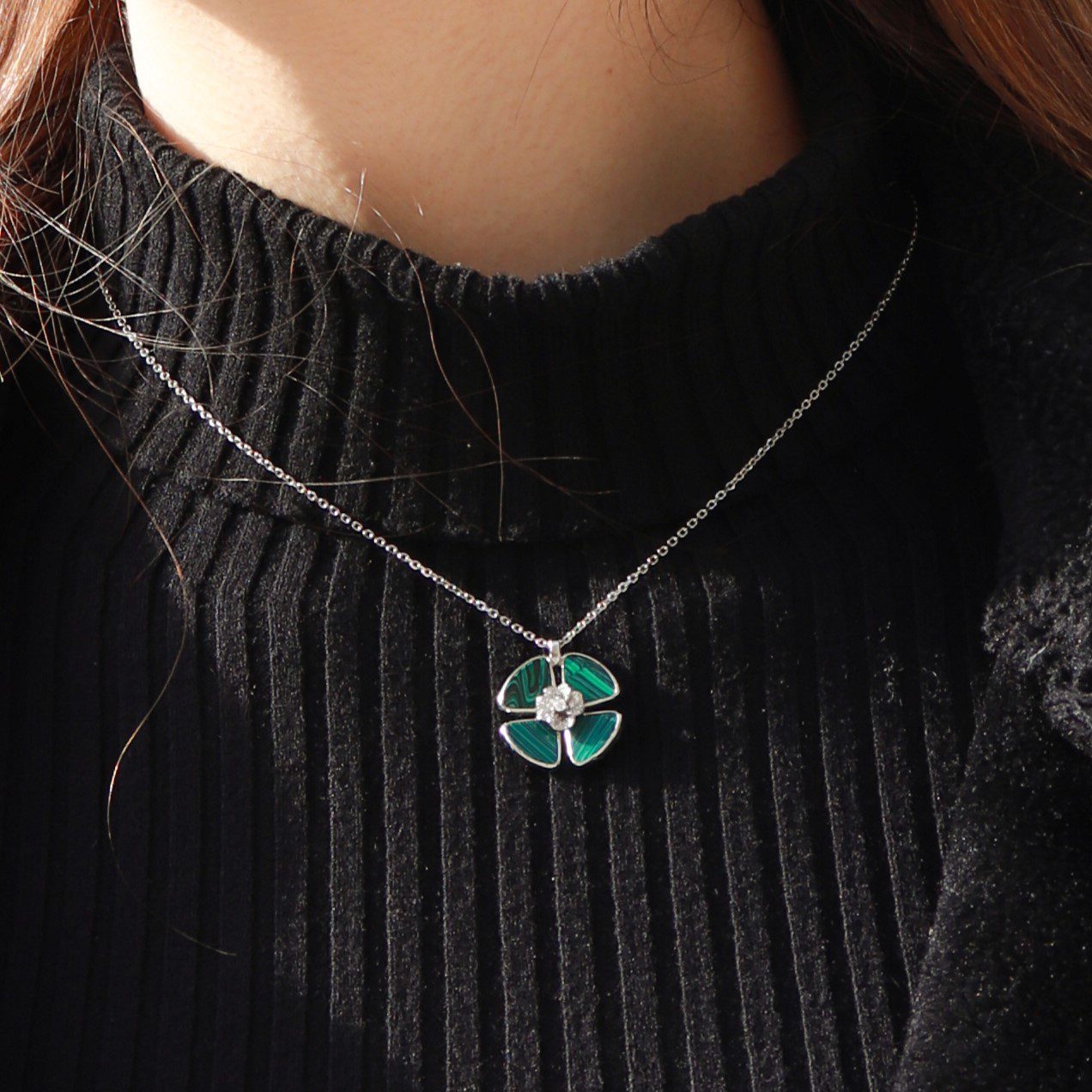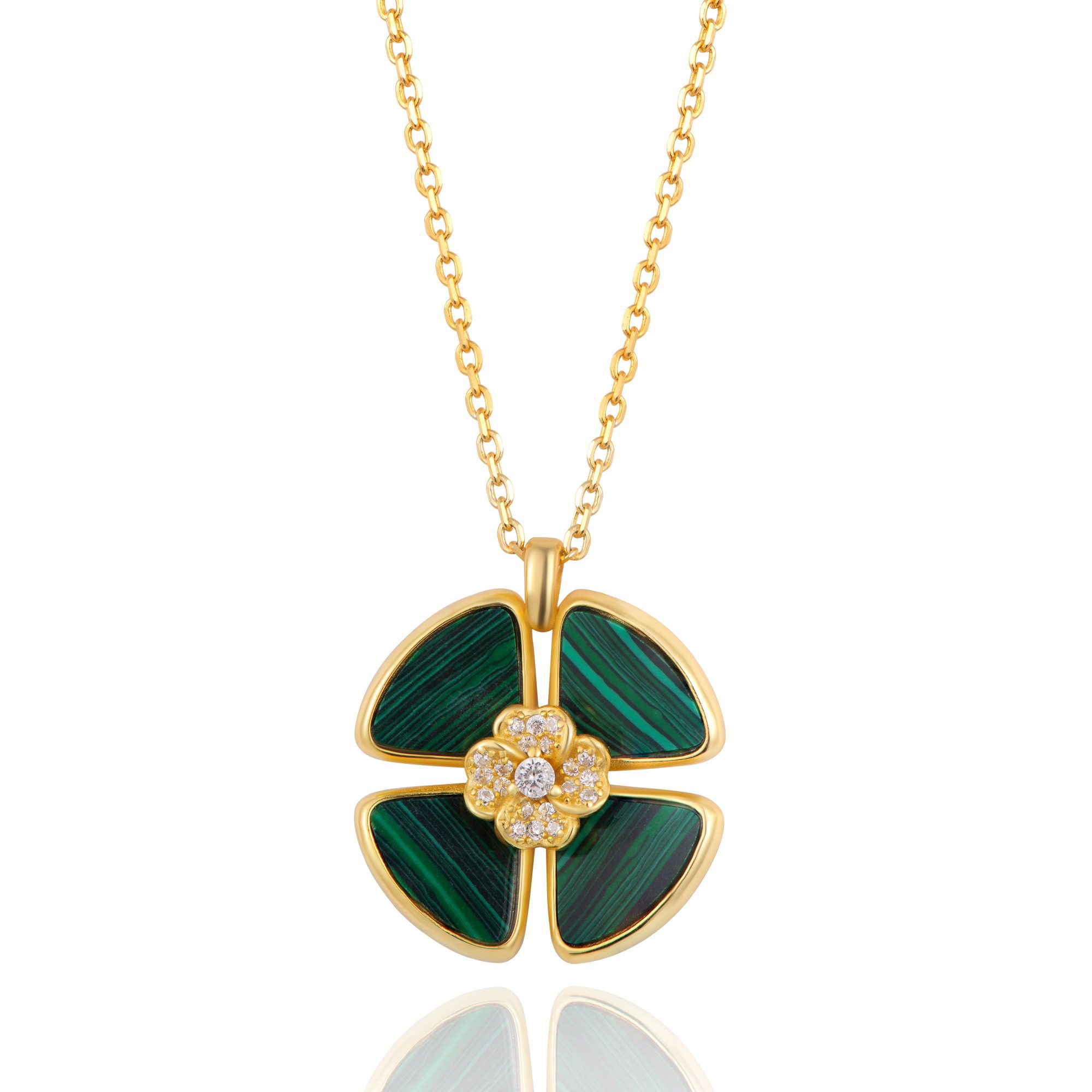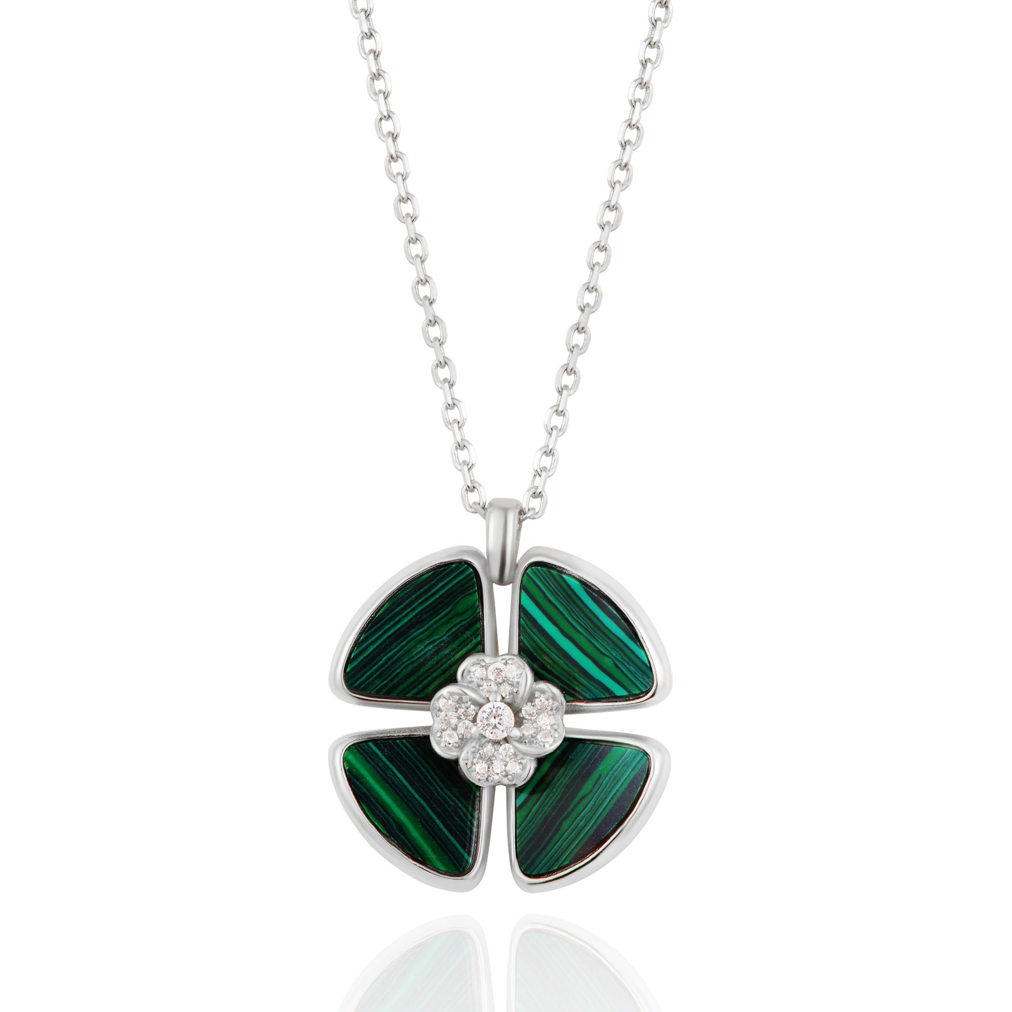 Colar em prata de lei. Formato de trevo em duas camadas. Trevo maior com pedra sintética tipo malaquite e trevo mais pequeno com zircónias.