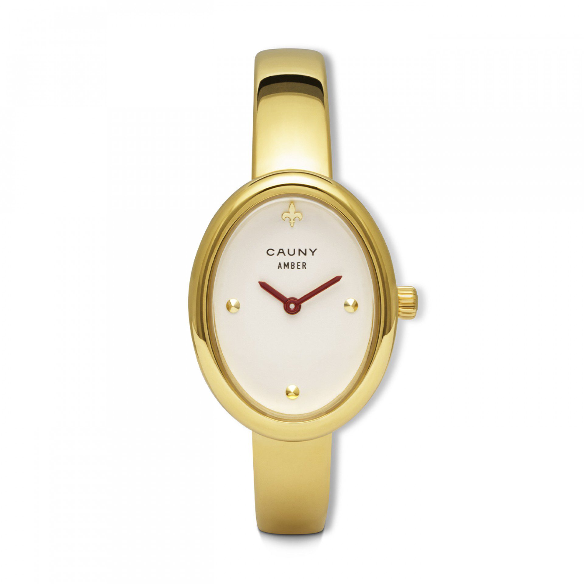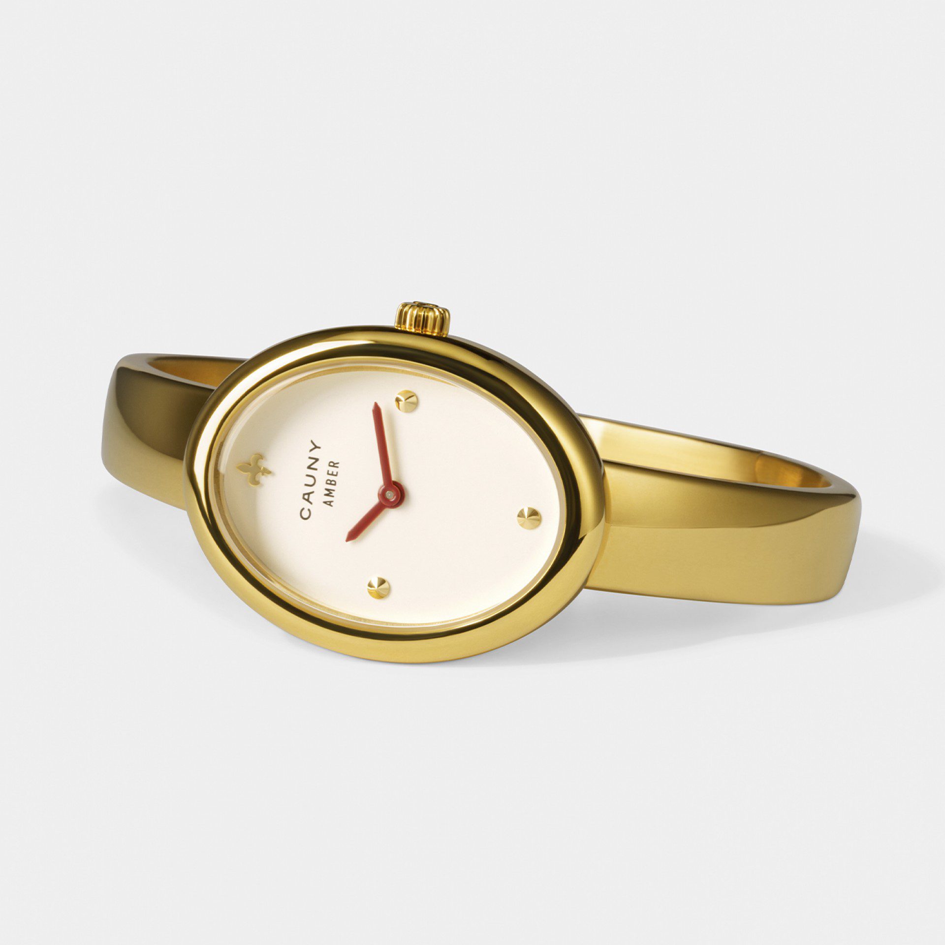 “O Cauny Amber capta a essência de uma joia moderna no pulso, definida por curvas suaves e uma silhueta escultural da pulseira. O mostrador branco com ponteiros bordeaux oferece um contraste subtil, mas marcante, realçando a arquitetura dourada da caixa e da bracelete.”