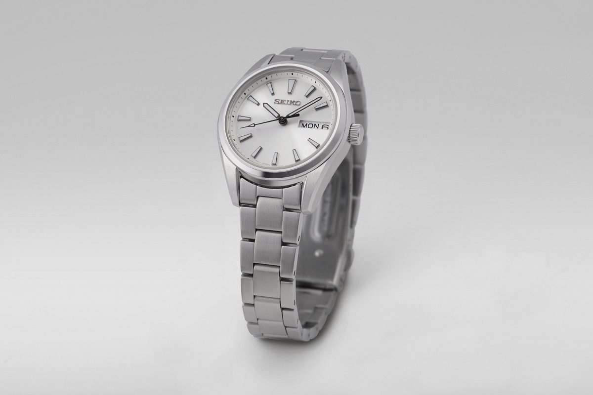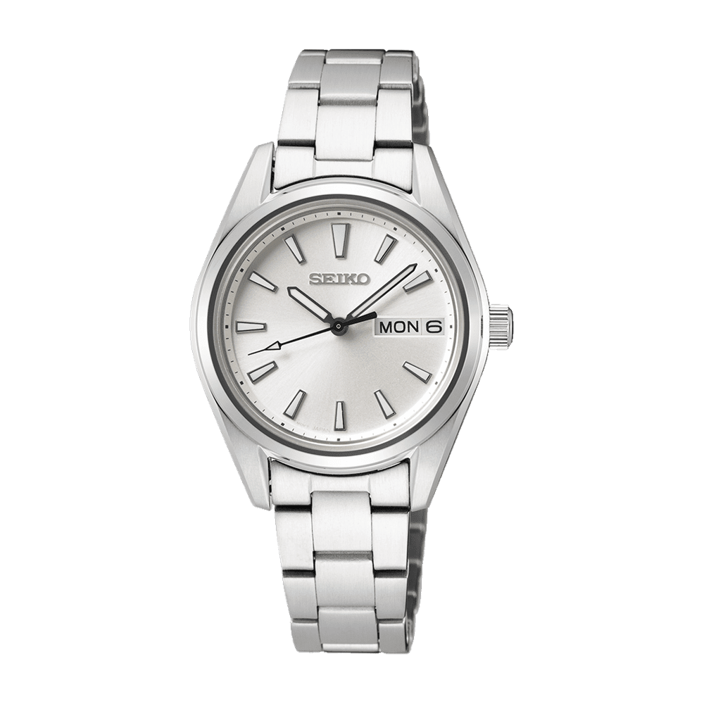 Relógio Seiko com movimento de quartzo e analógico, calibre 6N33, vidro de safira com mostrador branco de 29,8 mm, função de calendário e 3 ponteiros. Fecho de borboleta com botão e tampa de rosca. Bracelete e caixa prateadas. Caixa com 8,46 mm de altura.