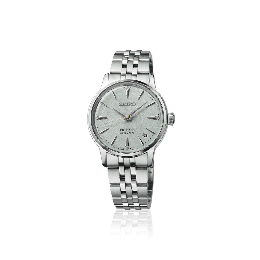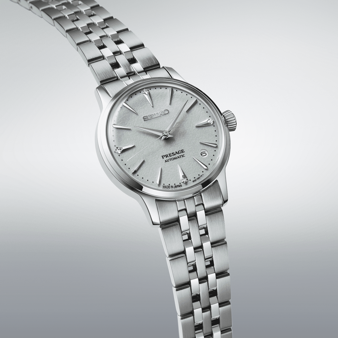 Relógio Seiko Presage Cocktail Time em Aço com diamantes e movimento automático com corda manual, calibre 4R35.