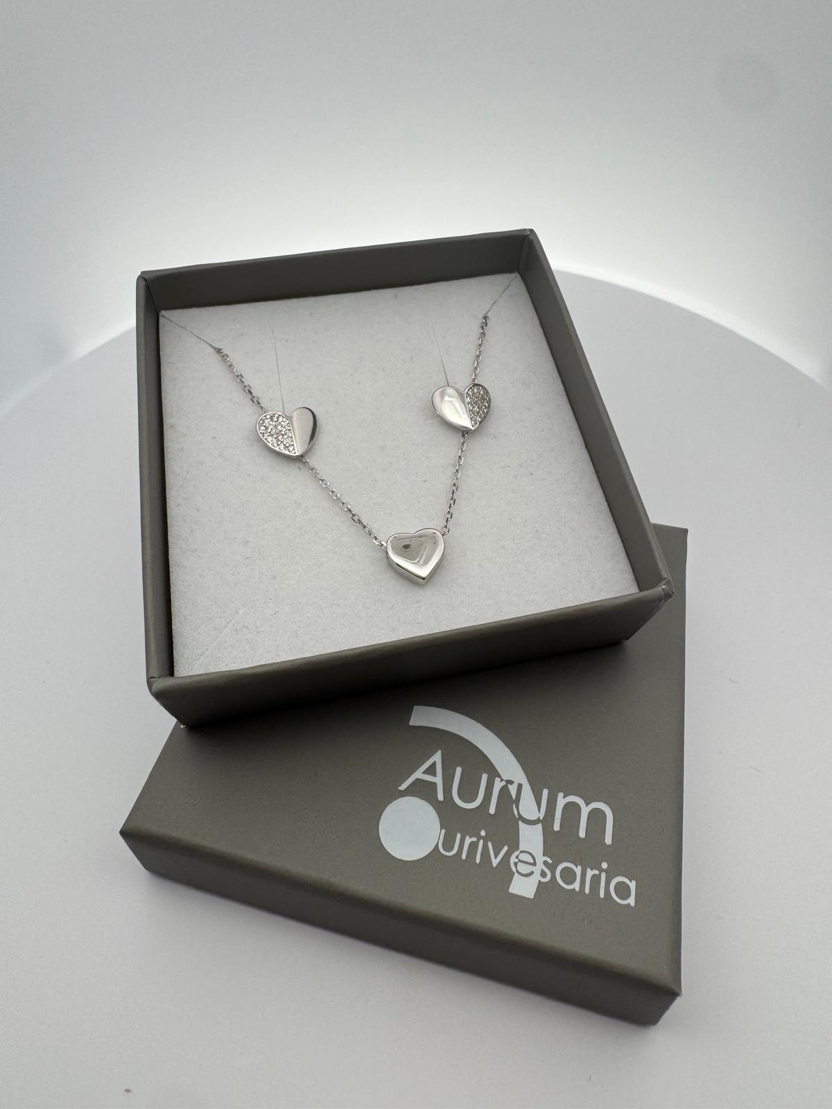Conjunto de brincos e colar em prata de lei com zircónias. Os brincos têm formato de coração com as abas do coração inclinadas para trás. O coração do colar é mais gordinho.