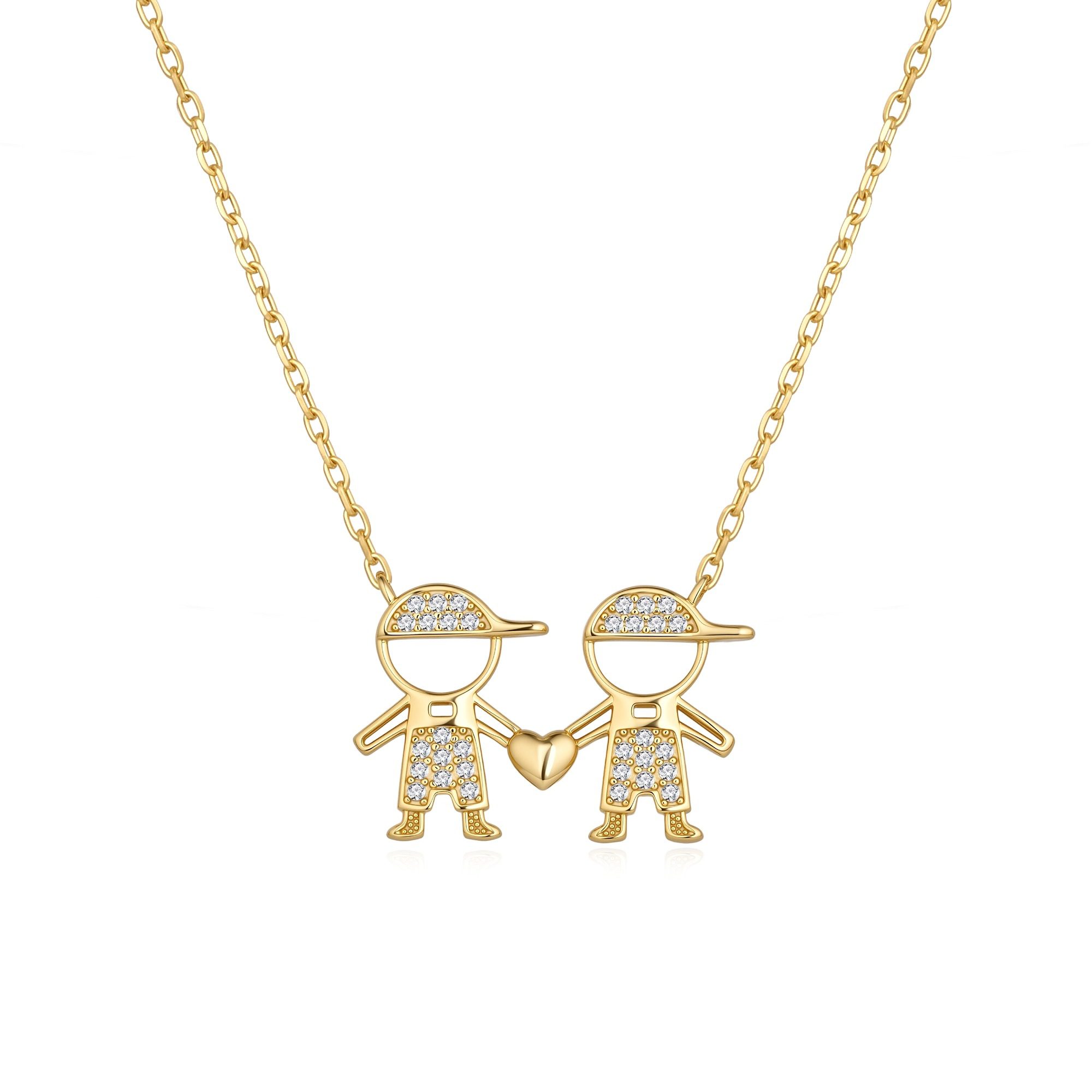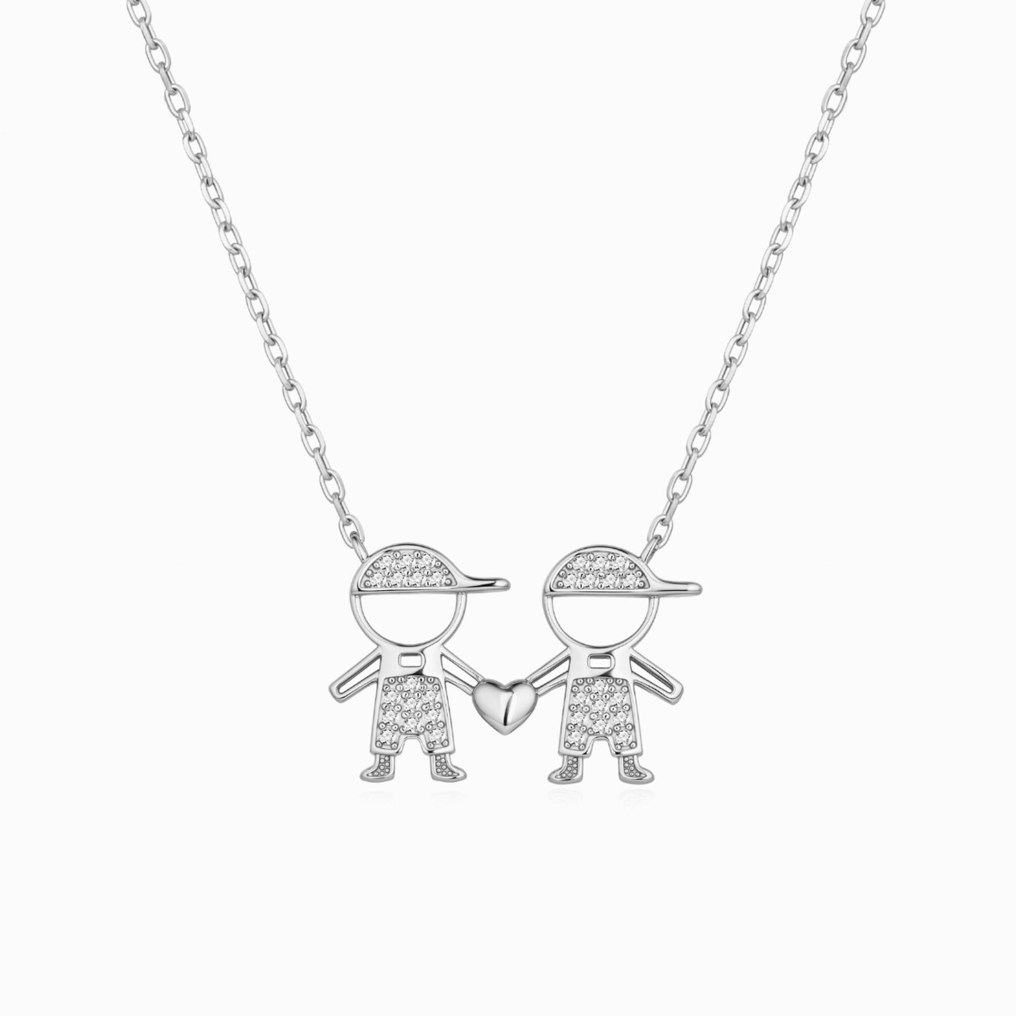 Colar em prata com dois meninos unidos pelas mãos através de um coração. Os meninos têm zircónias cravadas no chapéu, na roupa e nos pés.